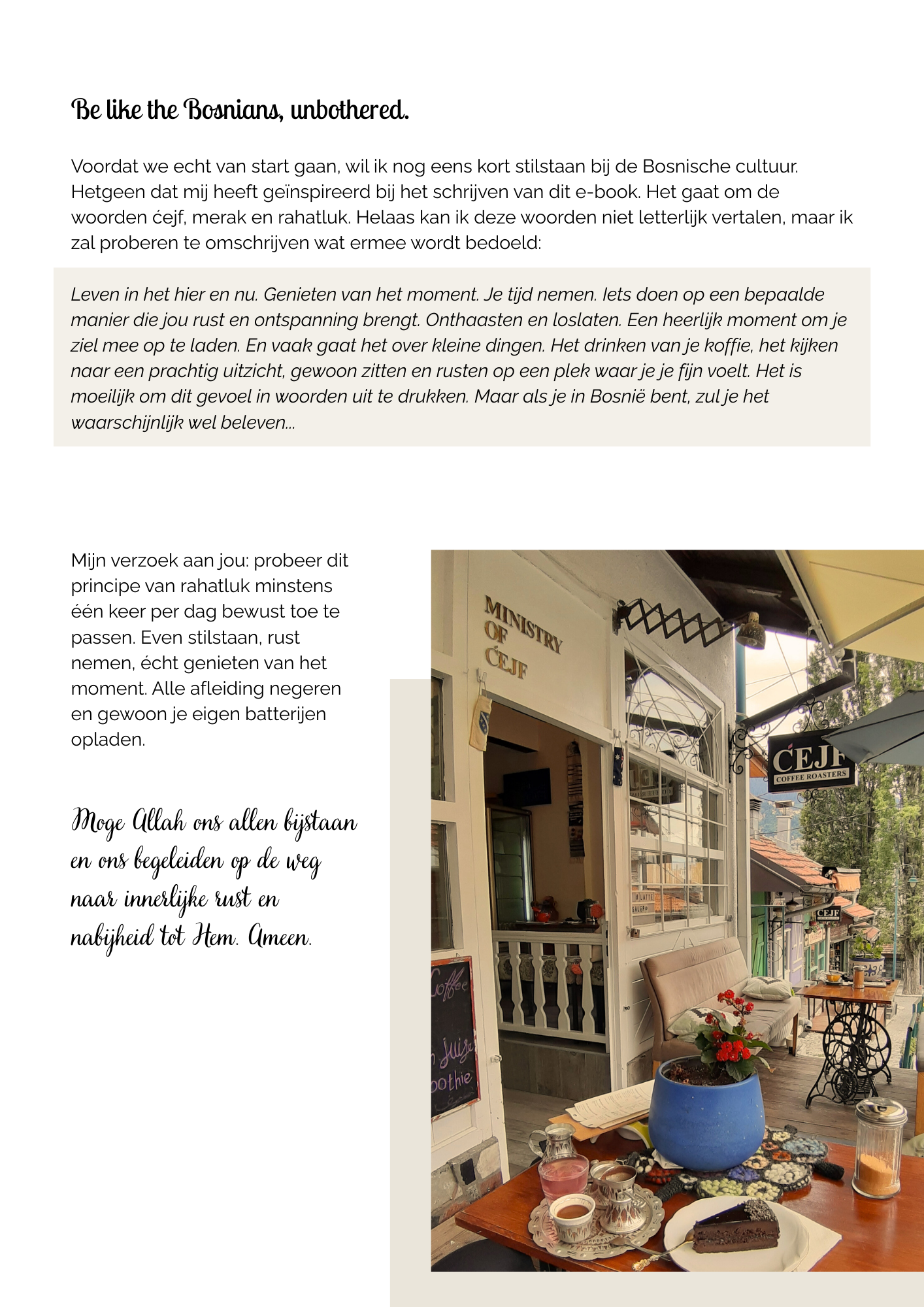 Ervaar je stress, zorgen of een dip in je imaan? Dit e-book is een liefdevolle uitnodiging om te vertragen, te helen en je hart te verbinden met Allah. Geïnspireerd door de Bosnische gewoonte van ćejf, merak en rahatluk (momenten van diepe rust en opladen), werk jij toe naar kalmte, veerkracht en tevredenheid.
